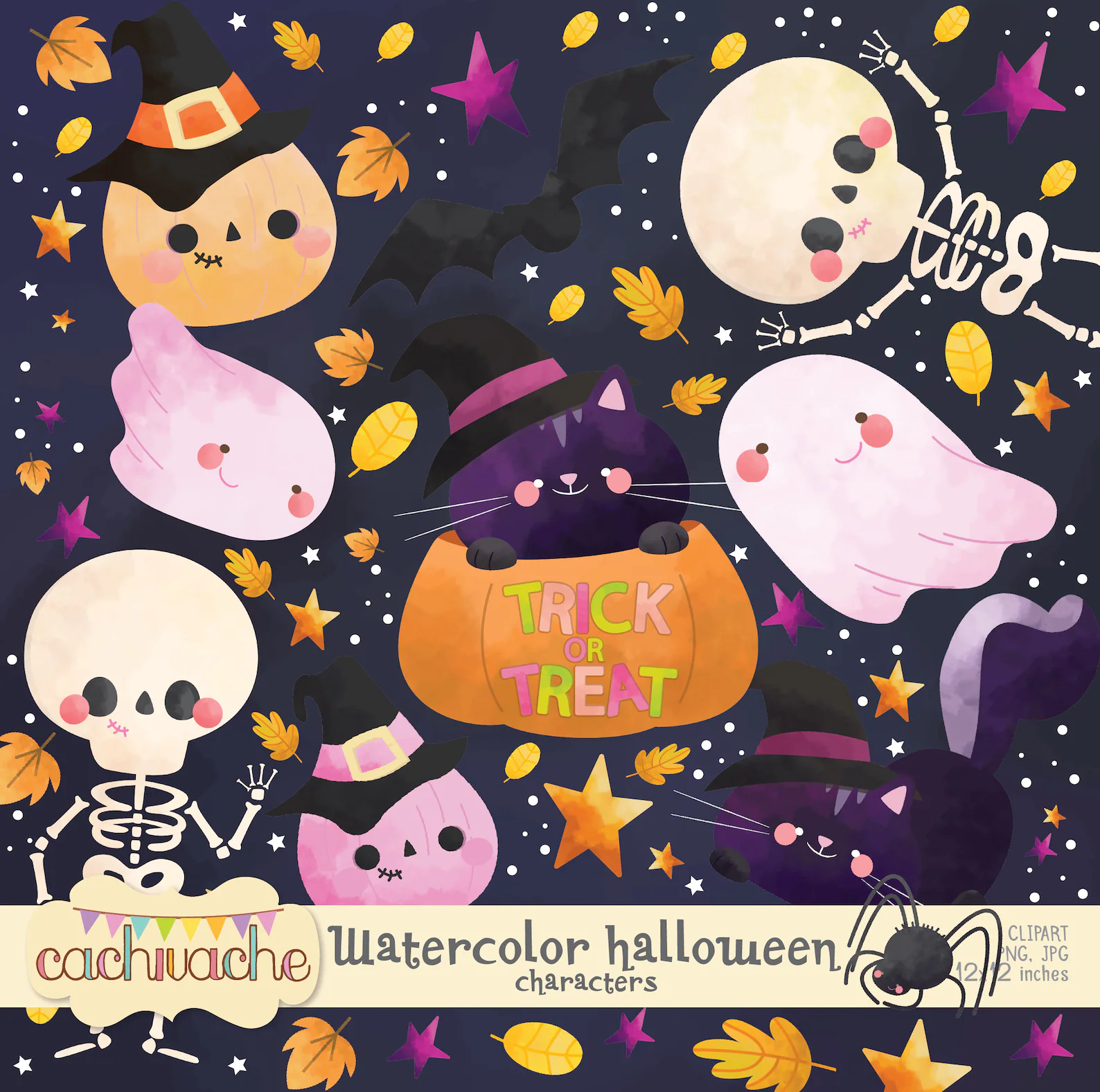 ¡Acuarela clipart de Halloween! Los personajes de Halloween como esqueletos y calabazas son los principales en esta temporada de Halloween, pero esta vez con las caras alegres no tan aterradoras. ¡Únete a su fiesta de Halloween y diviértete diseñando la tuya! ¡BOO tan aterrador!